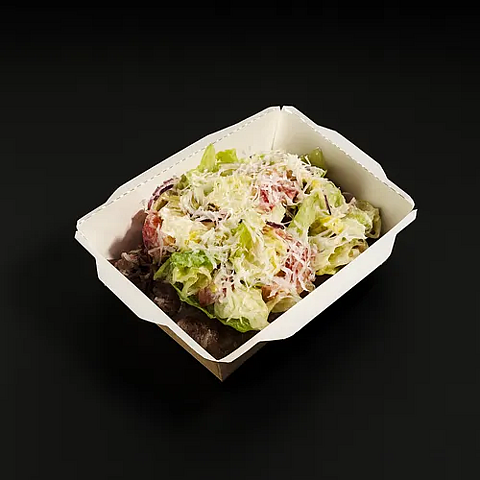 Говяжья котлета, свежие листья салата, помидоры, красный лук с заправкой соус гриль — салат с характером бургера.