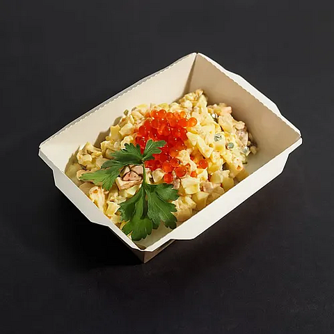 Оливье с нежным телячьим языком украшенный икрой — знакомый вкус в изысканной подаче.