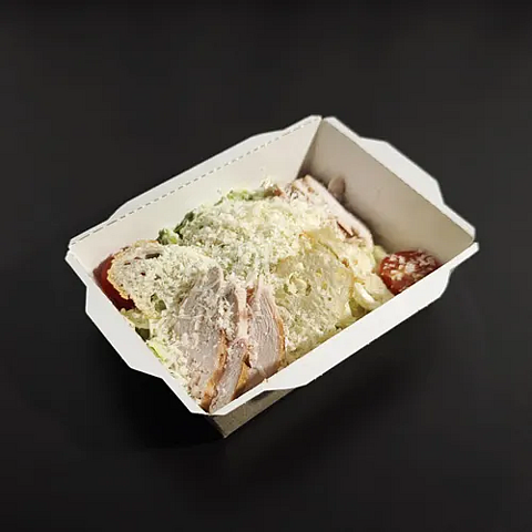 Салат с копчёной курицей, свежими листьями салата и хрустящими гренками, дополненный фирменным соусом «Цезарь».