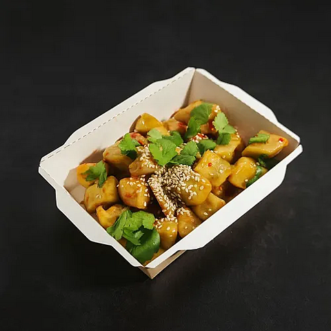 Хрустящие баклажаны, обжаренные во фритюре, с сочными помидорами и ярким кисло-сладким соусом.